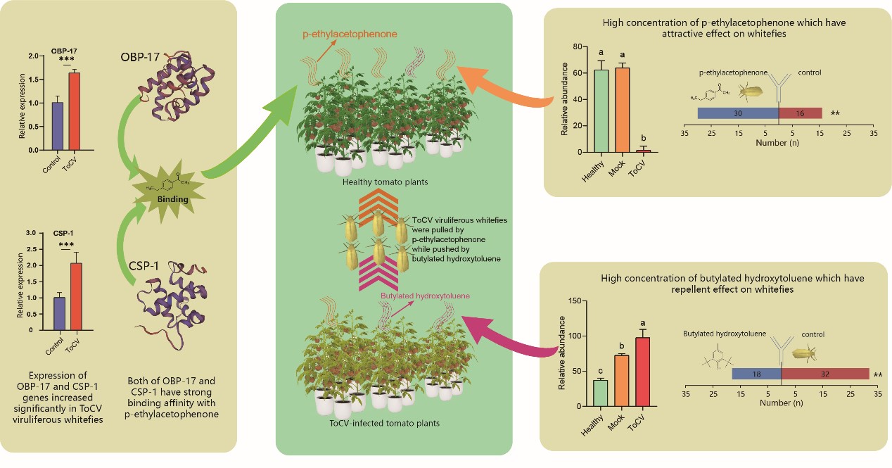 本研究首先证明烟粉虱MED的取食选择行为可以被病毒感染状态所扰动,即携带ToCV个体显著趋向健康番茄(“Y”型嗅觉仪数据结果),而未携带病毒的烟粉虱在健康番茄与病毒侵染番茄之间的选择结果并无差异,结果也暗示这种行为改变可能与嗅觉相关(参见原文)。进一步的,作者利用分子生态学方法检测了烟粉虱体内嗅觉相关基因的转录差异成功筛选到可能起关键作用的OBP-17与CSP-1基因;另一方面,作者利用化员工态学手段解析了番茄感染植物病毒前后的气质挥发物的成分差别,筛选出多种潜在化学物质,推测其中几种可能与烟粉虱嗅觉行为改变相关,其中最为重要的两中化合物是在病毒侵染番茄中显著下降的物质对乙基苯乙酮(p-ethylacetophenone)和显著上升的物质2,6二叔丁基对甲基苯酚(butylated hydroxytoluene)。利用荧光竞争试验最终筛选出对乙基苯乙酮是与两种蛋白(OBP-17与CSP-1)结合能力最强的物质。更进一步的试验表明对乙基苯乙酮可以诱导烟粉虱的行为和嗅觉基因转录,而且基因干扰试验表明两种关键基因的沉默可以显著降低烟粉虱对番茄的趋向。总之ToCV调控增强了烟粉虱中与对乙基苯乙酮强烈结合的基因表达,却又同时削弱了番茄中该化合物的释放,促使携带病毒的烟粉虱更加偏好健康的番茄,形成一种“双驱动”效应。因此,病毒得以传播和流行。
