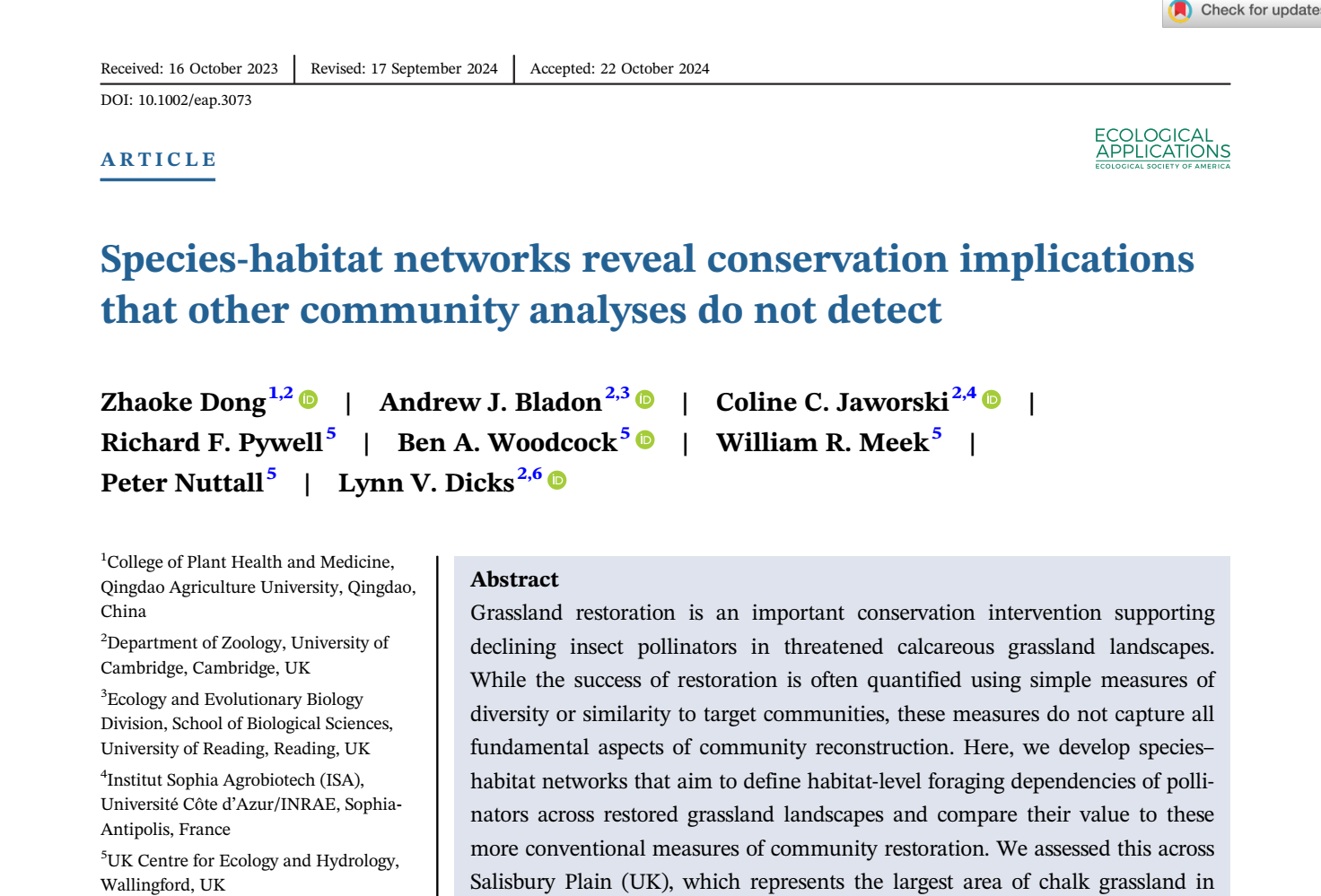 近日,beat365亚洲体育官方网站董兆克与剑桥大学合作在生态学领域著名期刊《Ecological Applications》(JCR一区,5年影响因子5.1)上发表题为“Species-habitat networks reveal conservation implications that other community analyses do not detect”的研究论文。该研究应用了物种-栖息地网络方法,提出了一种新的思路,用于评估草地恢复对授粉昆虫群落的影响,并与传统的群落恢复测量指标进行了对比。研究发现,恢复过程中受军事干扰的草地比农业干扰区的草地更能维持与古老草地相似的授粉昆虫群落结构,强调了栖息地历史在恢复过程中对群落重建的重要作用。