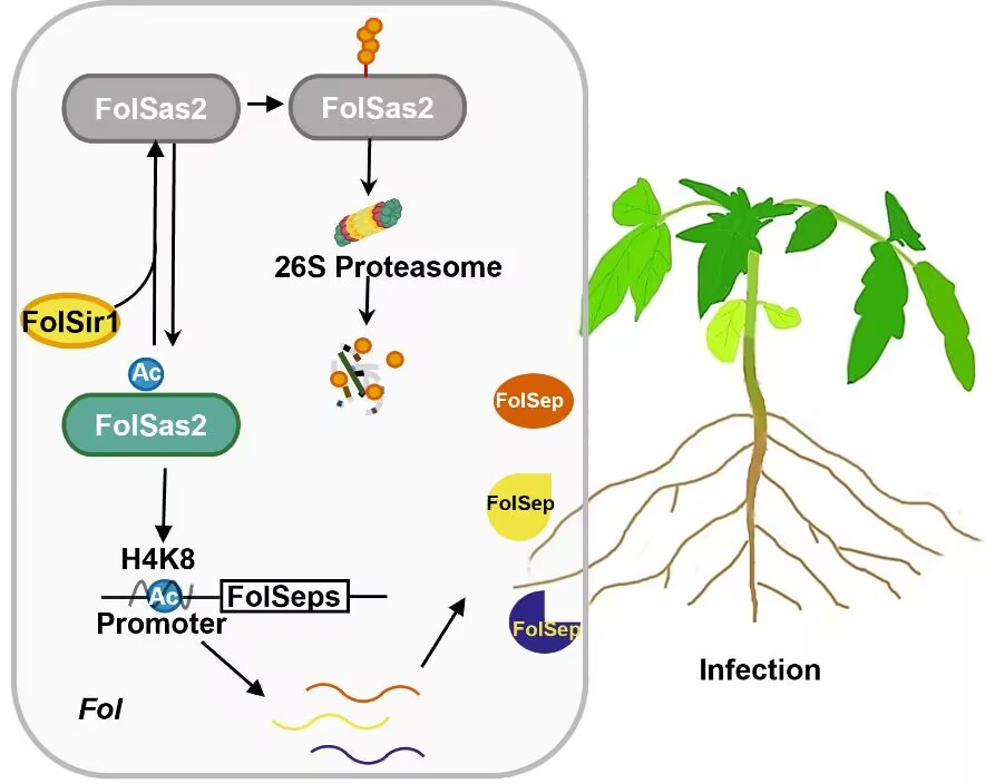 为了研究尖孢镰刀菌的致病机制,课题组前期通过质谱分析测定了其乙酰化蛋白质组,发现一个特异性作用于组蛋白H4K8的乙酰基转移酶FolSas2具有乙酰化修饰。FolSas2第269位赖氨酸(K269)的乙酰化修饰抑制了K335位点的泛素化修饰,从而阻止26S蛋白酶体对该蛋白的降解。
