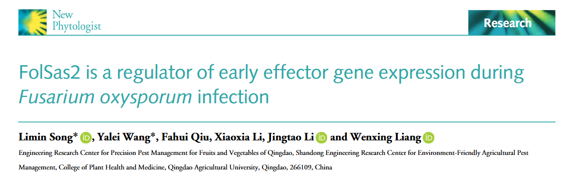 近日,beat365亚洲体育官方网站梁文星教授团队在国际权威期刊New Phytologist发表了题为“FolSas2 is a regulator of early effector gene expression during Fusarium oxysporum infection”的研究论文,解析了尖孢镰刀菌乙酰基转移酶通过对组蛋白H4K8的乙酰化修饰,调控早期效应蛋白的转录,从而促进病原菌侵染的分子机制。beat365亚洲体育官方网站宋丽敏副教授为第一作者,硕士研究生王亚蕾为共同第一作者,梁文星教授和李敬涛副教授为共同通讯作者。