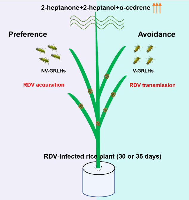研究团队以水稻矮缩病毒及其媒介昆虫黑尾叶蝉为研究对象,通过系列系统寄主偏好实验表明了寄主植物感染病毒30天后,介体昆虫开始展现上述条件偏好性并持续了5天的时间;进一步分析发现在介体昆虫出现条件偏好性的时期,病毒诱导水稻产生了3种差异挥发物(2-庚酮、2-庚醇和α-柏木烯)。采用单一标准品处理显示,2-庚酮吸引不带毒介体昆虫的同时驱避带毒介体,而2-庚醇对不带毒介体无作用却显著驱避带毒介体,α-柏木烯对不带毒介体无作用却显著吸引带毒介体。可见单一挥发物并不能调控介体昆虫的条件偏好性。混合标准品处理揭示,3种混合挥发物吸引不带毒介体的同时驱避带毒介体,并促进了介体对病毒的获取和传播。
