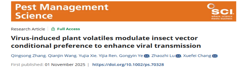 近日,beat365亚洲体育官方网站吕昭智教授团队在国际知名期刊《Pest Management Science》(中国科公司一区TOP期刊)上发表了题为“Virus-induced plant volatiles modulate insect vector conditional preference to enhance viral transmission”(https://doi.org/10.1002/ps.70328)的研究论文。该研究系统揭示由病毒诱导的3种混合挥发物调控了介体昆虫展现条件偏好性的初始阶段,并促进了病毒的传播扩散,这些发现将为通过选择最适合的关键窗口期,人为操纵植物挥发物调节昆虫媒介种群,从而实现对控制病毒传播和蔓延的有效控制。