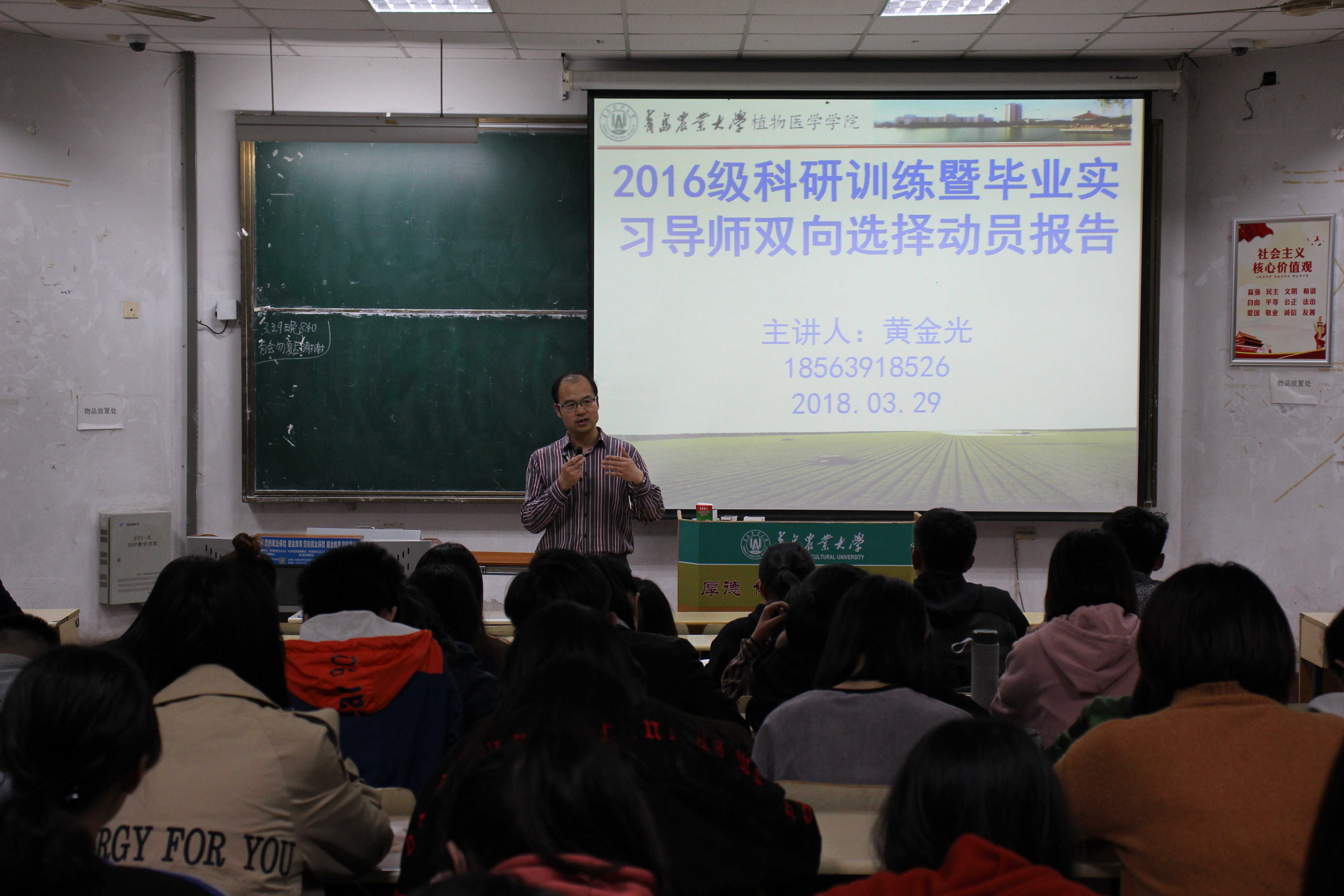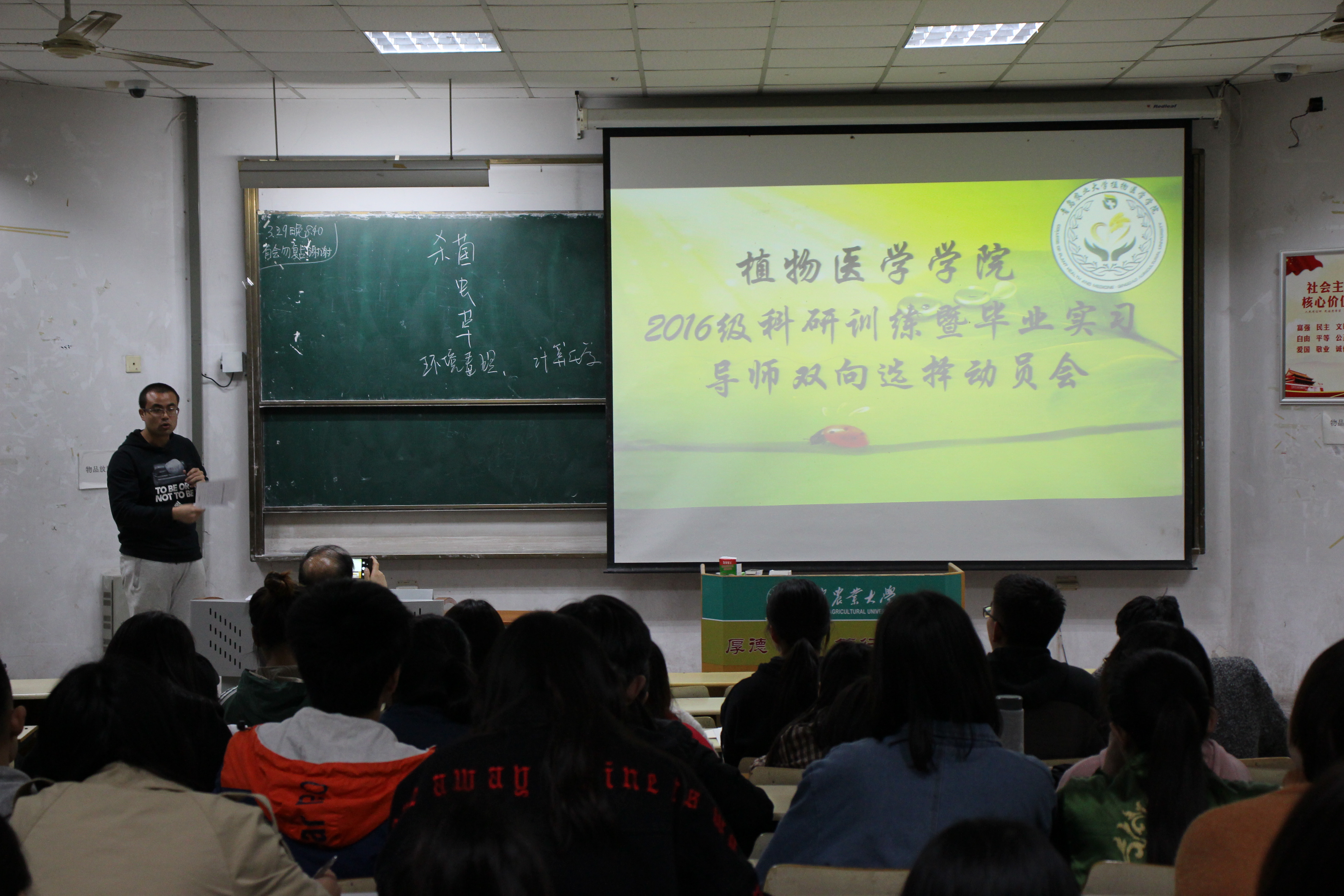 黄金光在会议上作2016级科研训练暨毕业实习导师双向选择动员报告,简要介绍了新公司的情况以及实行导师制背景,为充分发挥教师在人才培养中主导作用,实现培养具有远大视野、开阔胸怀、社会责任意识以及终身学习和自我完善能力的创新型、应用型高素质农林卓越人才培养目标,beat365亚洲体育官方网站在本科生公司产品中实行导师制,黄金光详细解读了《beat365亚洲体育官方网站本科生导师制试行管理办法》,新的导师制管理办法包括导师的任职条件、导师的工作职责、导师的配备办法、导师的工作要求、导师的工作考核、导师的组织管理、员工的要求等七部分、共计22条。他并以问卷调查的方式让同学们认识到植物保护专业在各自心中的定位,从而更好的选择导师,提升自己的能力。“优良的团队队伍是教学质量稳步提高的根本保证”,黄金光指出,实习导师的选择事关公司每一位同学未来的发展,希望同学们以本次报告会为契机,以万全的准备对待实习导师的选择,这不仅对同学们的考研和就业具有引导作用,更有利于培养员工严谨、求实的治学态度和刻苦钻研、勇于探索、团结协作的精神。