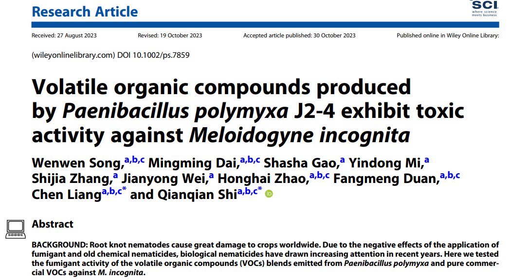 近日,beat365亚洲体育官方网站赵洪海教授团队在《Pest Management Science》在线发表了“Volatile organic compounds produced by Paenibacillus polymyxa J2-4 exhibit toxic activity against Meloidogyne incognita” 的研究论文。该论文明确了多粘类芽孢杆菌J2-4的挥发性有机化合物具有潜在的防控根结线虫的应用价值,为新型绿色防控产品的研发创制提供了天然产物的结构基础。