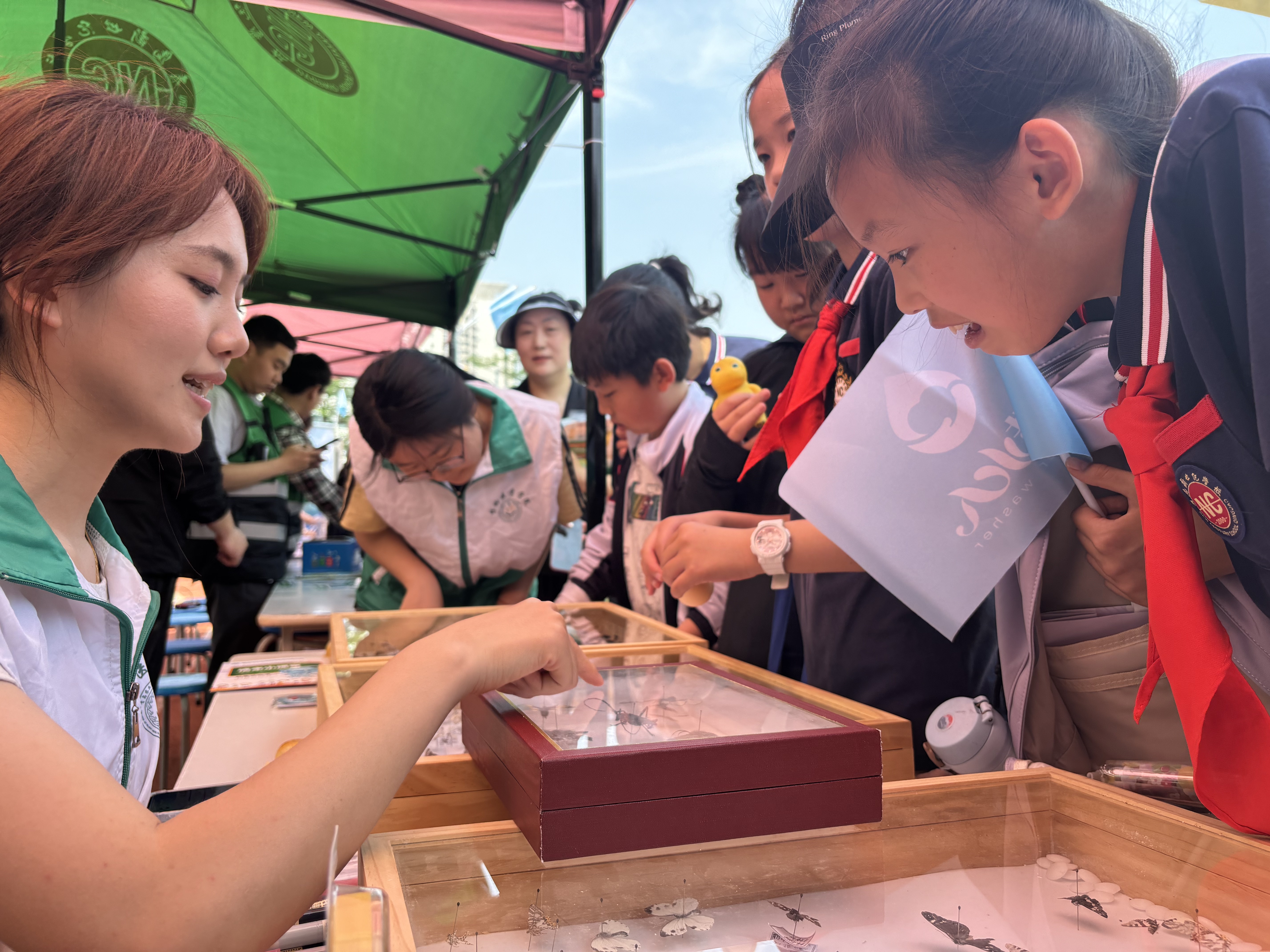 面对小朋友的提问,团队成员详细讲述了昆虫的生活习性对于生物多样性的重要作用。大家纷纷踊跃参与活动,现场气氛热烈。