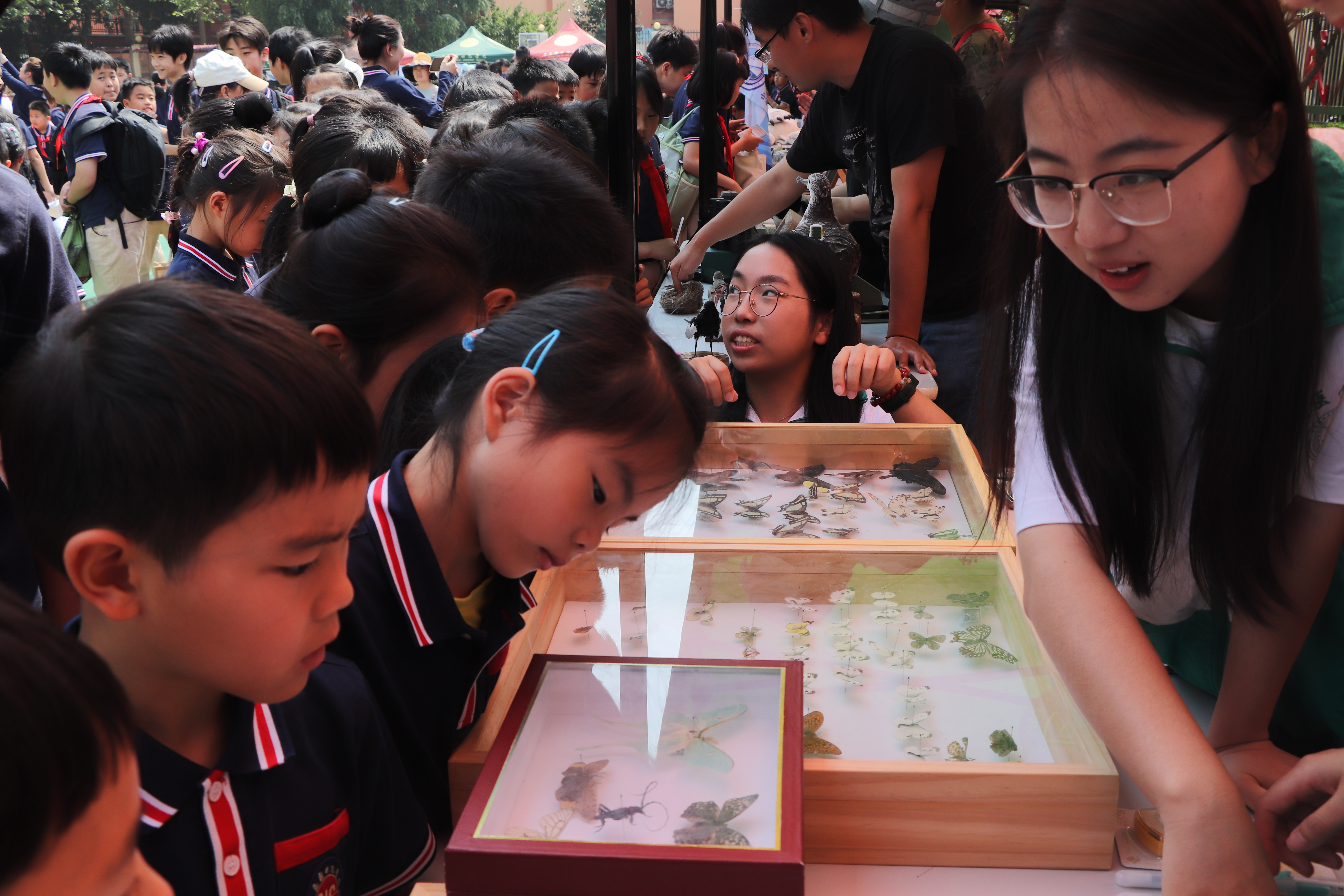 活动中,带队老师满彦利,团队成员钟倩、陈昱、王姿萱、侯洁、罗丹丹通过标本讲解向孩子们宣传昆虫科普知识。团队通过讲解蝉,蝽,蝴蝶,蛾四大常见昆虫,带领孩子们了解生物多样性以及昆虫在我们日常生活的作用及其重要性。
