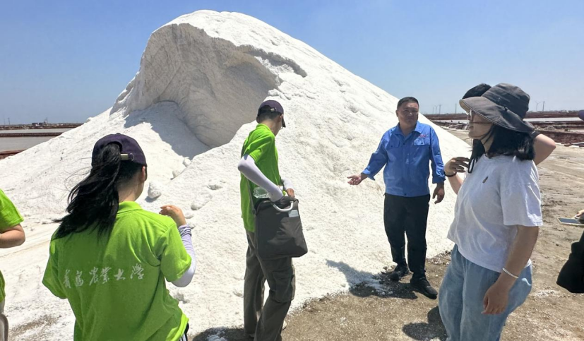 随后,成员们参观了恒联盐场。在阳光的照射下,数万亩的盐田里银光闪闪。负责人讲解到,这里的盐来源是地下卤水,盐场下覆塑料膜防止渗漏,盐场坚持一天一活碴,促进原盐结晶饱满、颗粒均匀,保证原盐质量。团队成员对盐碱地有了更深入的了解,纷纷表示要牢记强农兴农使命,发挥学科优势,为当地发展献策助力。