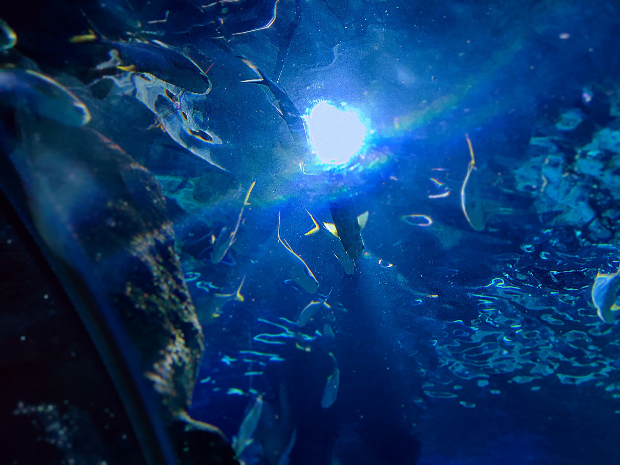 原本灼眼的日光经过大海的反射之后,只有一点点微光进入海里,让原本漆黑,阴冷的海洋变得微亮,但只是这一点点微光,就足以让迷茫的鱼有了方向,共同朝着这点微光,游向未知的远方。以此激励那些原本有着强烈的梦想,但被挫折磨灭了的人,不要放弃,只要有一点点希望,就朝着希望的方向前进。