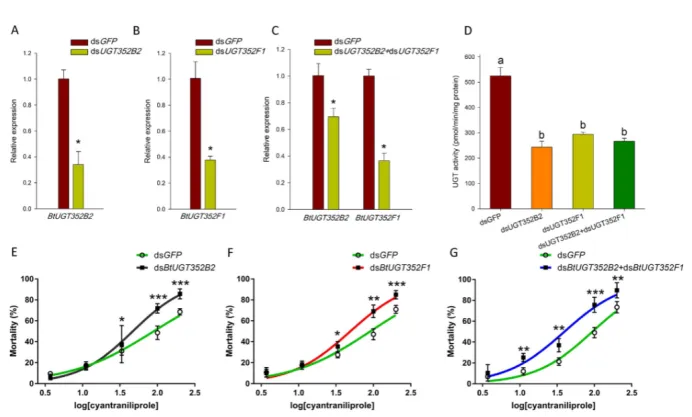RNA测序与RT-qPCR验证发现,BtUGT352B2和BtUGT352F1在所有抗性品系中均显著过表达(2.07-15.56倍)。