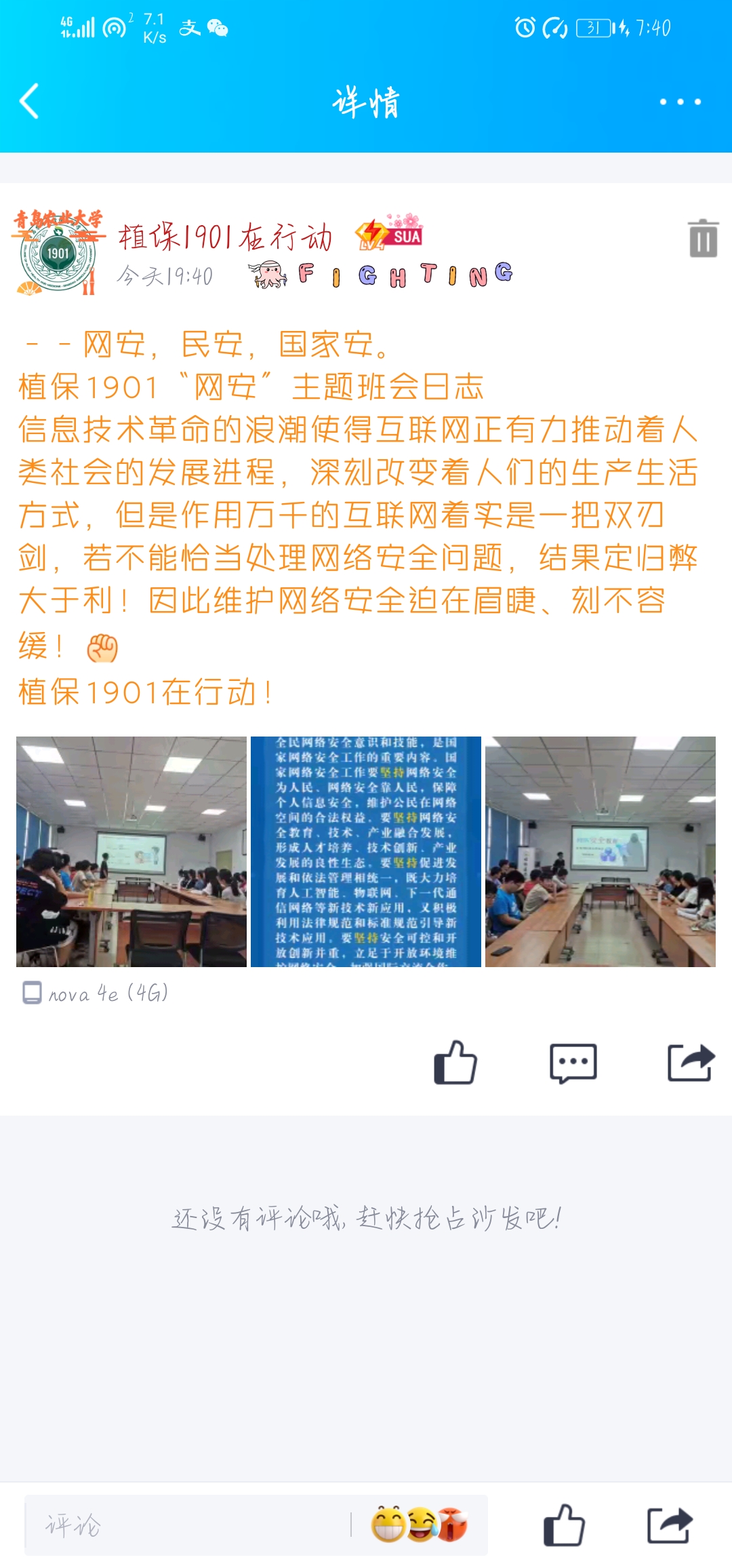 为深入贯彻落实习近平总书记对国家网络安全宣传周做出的“四个坚持”重要指示,进一步增强同学网络安全意识,提高网络信息甄别能力,9月15日,公司开展主题为“网络安全为人民,网络安全靠人民”的专项宣传活动。公司各班级积极参与。