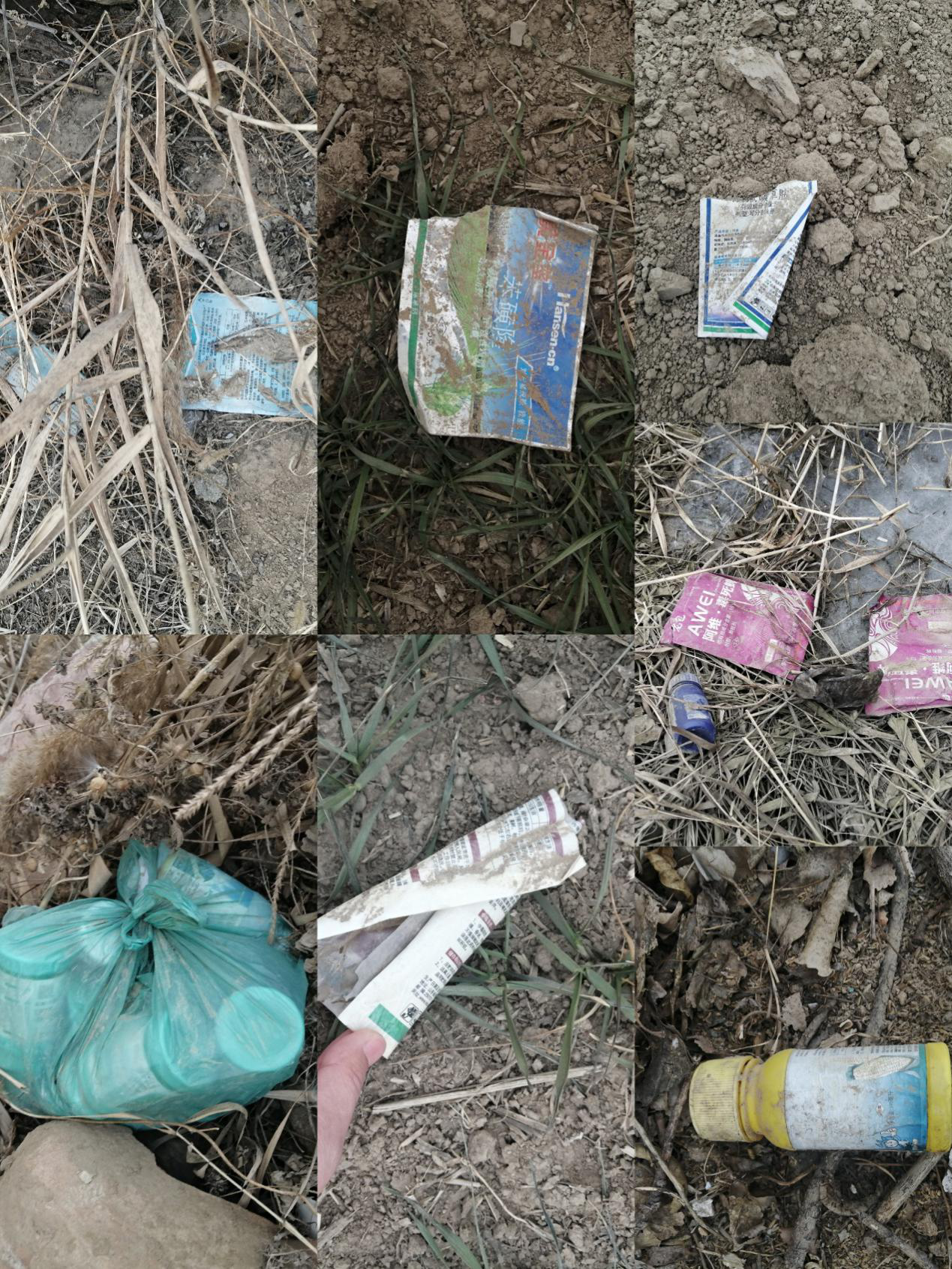 在采访调查过程中,队员们发现,村民往往在清澈的溪流中配兑农药后,随手丢弃有残余农药的空瓶、空袋,严重污染了水资源,破坏了生态环境。在农村,废弃农药瓶、袋在水塘、小溪及河水中漂浮的景象随处可见,而有许多村民就是在这样的情况下,直接取水用于生活,带来一定的安全隐患。结合实践与调查资料,队员们了解到目前农药包装废弃物以玻璃、塑料等材质为主,这些材料在自然环境中难以降解,散落于田间、水体等自然环境中,造成严重的污染;在土壤中形成阻隔层,影响植物根系的生长扩展,阻碍植株对土壤养分和水分的吸收,导致田间作物减产;在耕作土壤中影响农机具的作业质量,进入水体造成沟渠堵塞;破碎的玻璃瓶还可能对田间耕作的人畜造成直接伤害。同时,农药包装废弃物中包含的残余农药也有毒性危害。农药包装废弃物中残留农药随包装物随机移动,对土壤、地表水、地下水和农产品等造成直接污染,并进一步进入生物链,对环境生物和人类健康都具有长期和潜在的危害;农药包装废弃物对食品安全、生态安全,乃至公共安全都存在着隐患。在提倡食品安全,提倡绿色农业,发展无公害农业的今天,农药使用安全已经成为各级政府和公众普遍关注的焦点问题,农业面源污染正在成为农业环境治理的重点领域,农药包装废弃物的管理也逐渐引起政府和民众的重视。