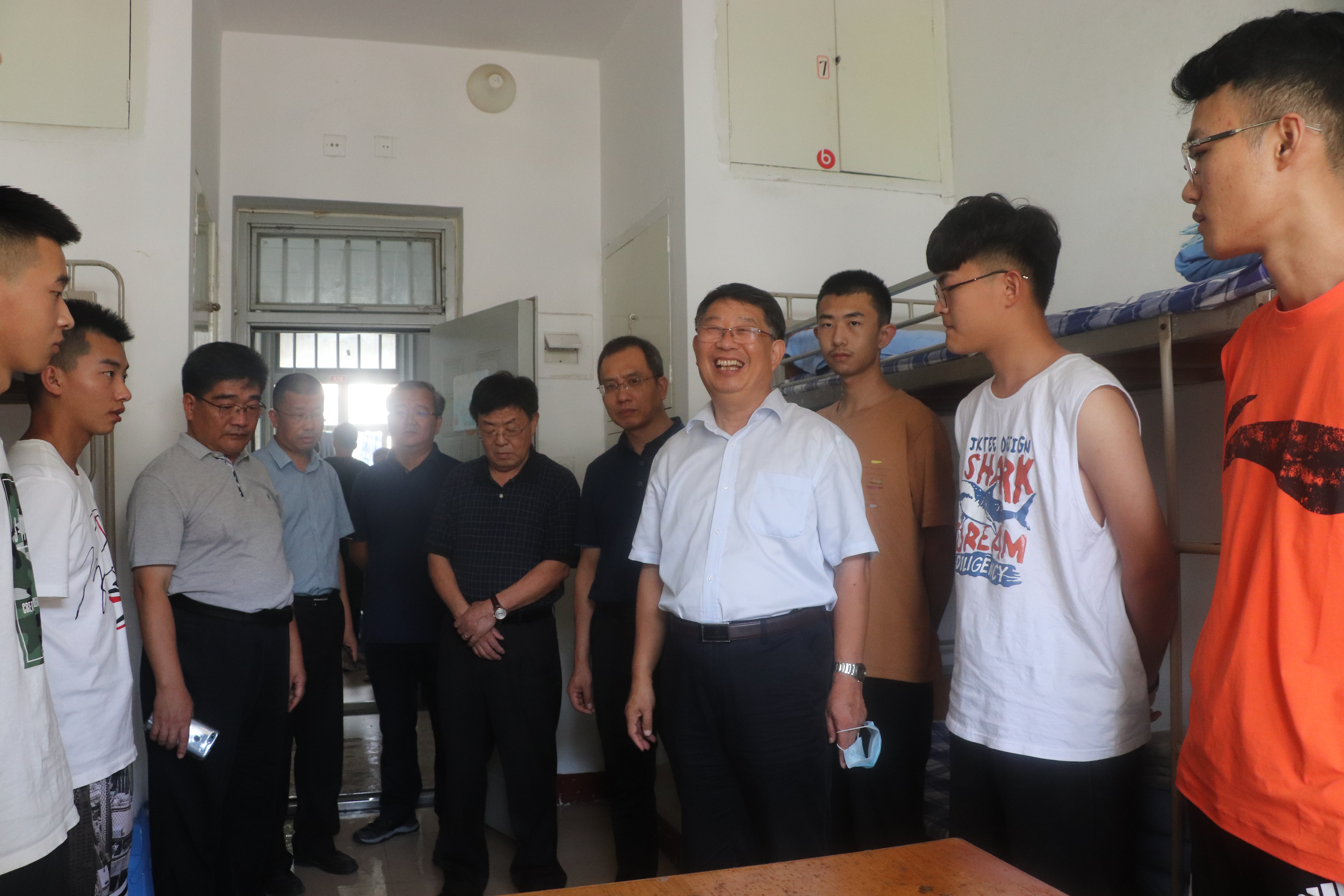 9月13日下午,青岛农业大公司党委书记李宝笃,党委副书记单连岱,学工部部长王清春前往宿舍区走访慰问2020级新生,公司党总支书记韩强,经理刘同先等人陪同走访。