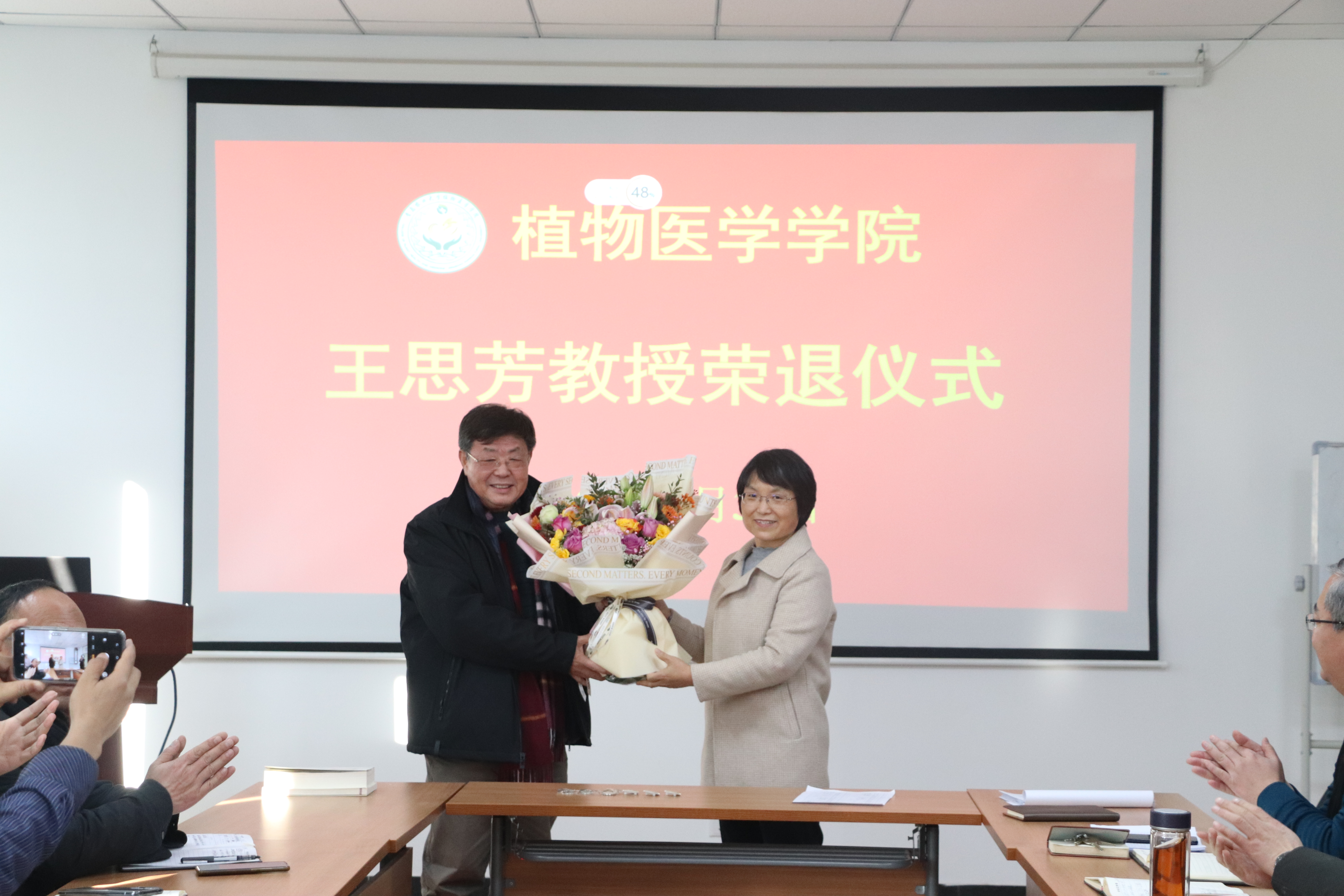 王思芳老师荣退仪式上,韩强首先对王思芳老师的从教经历和先进事迹进行了介绍,对其为公司和植保学科的建设发展所付出的辛勤劳动表示衷心感谢,同时真诚地希望王思芳老师退休不退志,离岗不离心,继续关心和支持公司和植保学科的建设和发展,继续关心和支持公司青年教师的成长和进步。刘同先为王思芳老师送上鲜花和全院教职工共同完成的临别寄语手册,祝福王老师身体健康,家庭幸福。王思芳老师发表了退休感言,感谢公司一直以来对其工作的关心、支持,感谢公司全体教职工对自己的支持、帮助,希望公司在今后的事业发展中继往开来、再创辉煌。