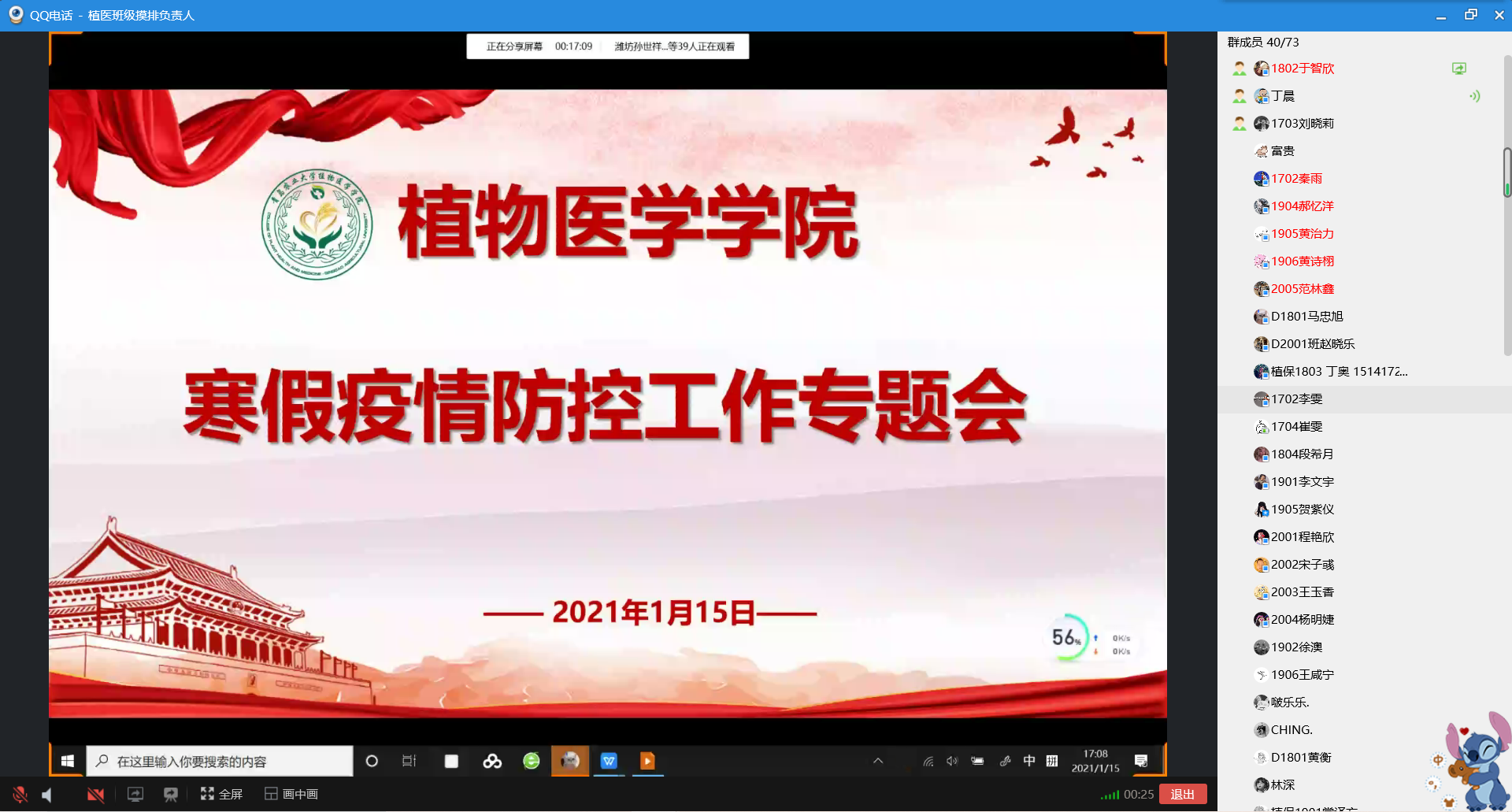 为贯彻落实公司下发有关疫情防控文件精神,严格落实疫情防控常态化措施,继续做好假期疫情防控工作,1月15日,公司开展员工寒假疫情防控工作专题线上会,公司辅导员丁晨出席并主讲,公司各班级负责人参加会议。