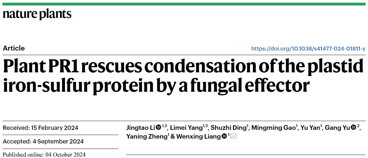 近日,beat365亚洲体育官方网站梁文星教授团队在国际顶级期刊Nature Plants发表了题为“Plant PR1 rescues condensation of the plastid iron-sulfur protein by a fungal effector”的研究论文(论文链接:https://www.nature.com/articles/s41477-024-01811-y),解析了尖孢镰刀菌效应蛋白在寄主胞内通过相分离凝聚铁硫蛋白抑制寄主活性氧产生,然而番茄病程相关蛋白PR1可阻止效应蛋白从质外体进入寄主胞内从而介导抗性的分子机制。beat365亚洲体育官方网站李敬涛副教授为第一作者、硕士研究生杨莉梅为共同第一作者,梁文星教授为唯一通讯作者。
