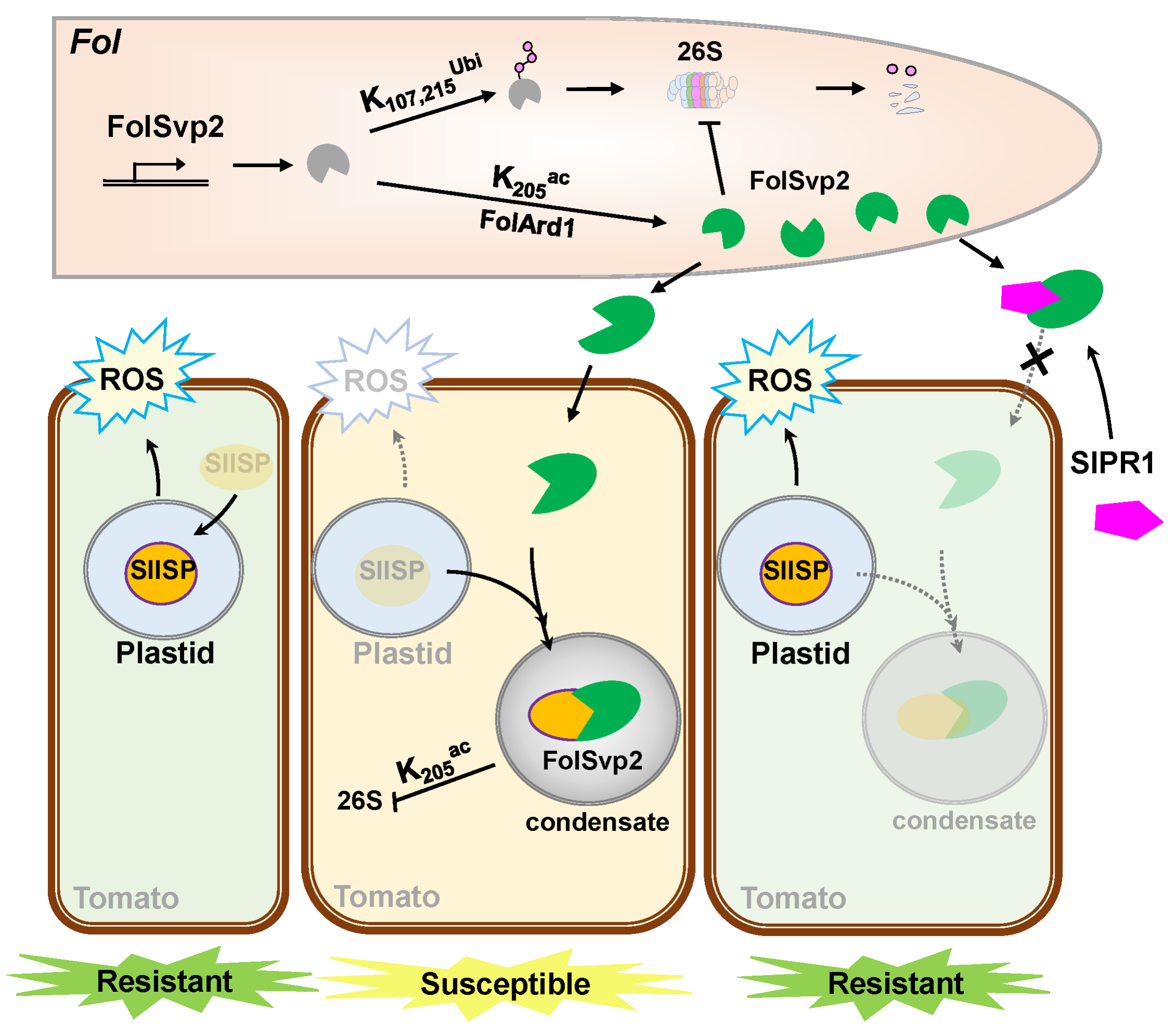为了研究尖孢镰刀菌的致病机制,课题组前期通过质谱鉴定了尖孢镰刀菌的分泌蛋白,本研究发现其中一个分泌的毒性蛋白FolSvp2可以进入寄主胞内,通过自身相分离形成凝聚体,同时FolSvp2劫持寄主铁硫蛋白SlISP并与之共凝聚,改变SlISP的质体定位,从而抑制SlISP介导的活性氧产生和寄主抗病性。进一步研究发现乙酰化修饰正调控FolSvp2介导的致病性,病原菌乙酰基转移酶FolArd1在赖氨酸K205残基上乙酰化修饰FolSvp2,该位点的乙酰化抑制了FolSvp2在真菌及寄主中的泛素化降解,从而促进FolSvp2的稳定和毒性。