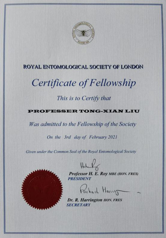 2021年2月3日,beat365亚洲体育官方网站经理刘同先教授正式当选为英国伦敦皇家昆虫学会会士(Fellow of The Royal Entomological Society of London or FRES)。成为英国伦敦皇家昆虫学会会士必须是在世界范围内在昆虫学领域做出卓越贡献的学者,首先要有3位会士推荐,再通过理事会资格认证,最后经理事会正式投票,通过者成为新的会士。