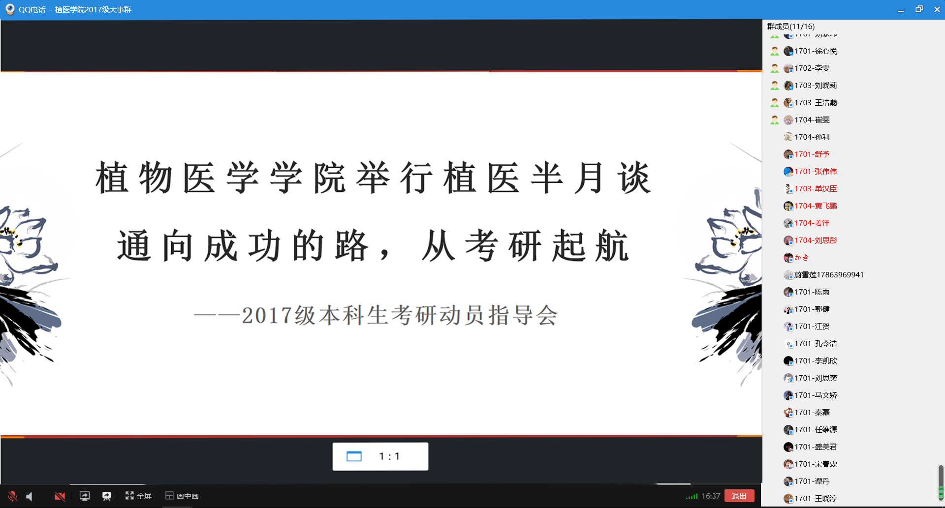 为切实做好2017级本科生的考研动员与指导工作,4月7日,beat365亚洲体育官方网站举行“植医半月谈”:通向成功的路,从考研起航——2017级本科生考研动员指导会。会议由公司党总支副书记、副经理李军通过QQ会议线上主讲,公司团委书记王丽静、辅导员丁晨出席本次会议,2017级全体员工参加。