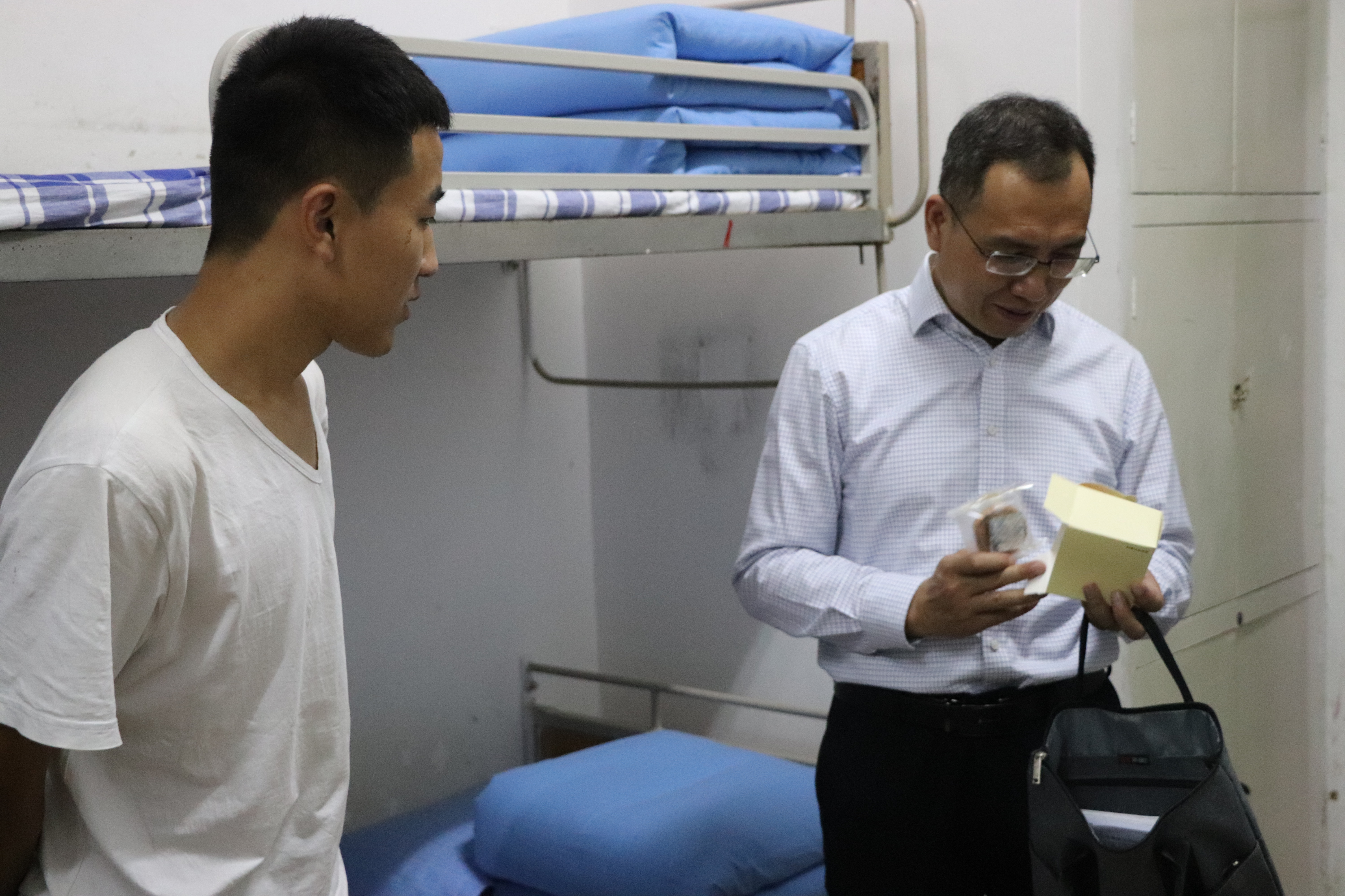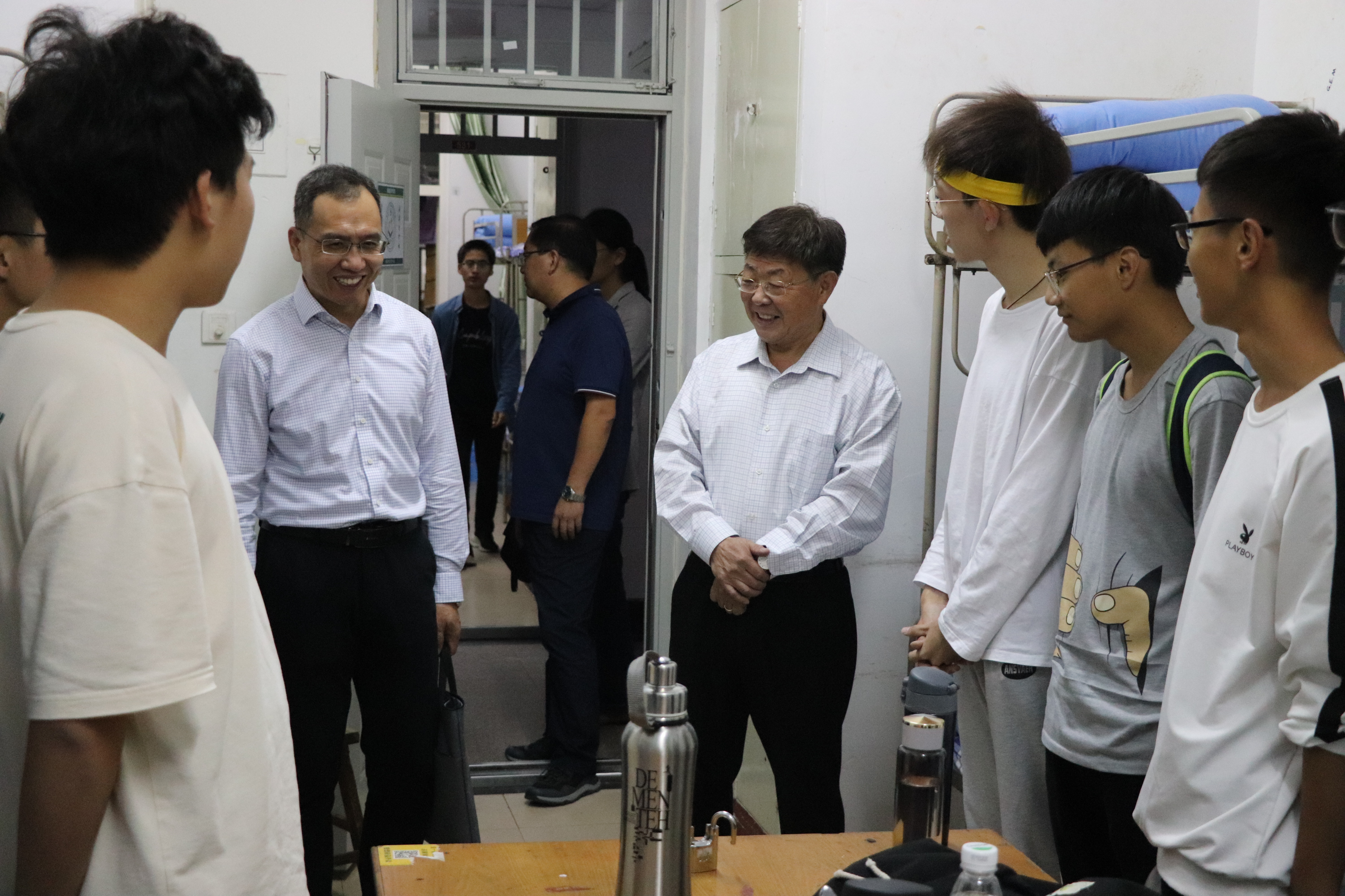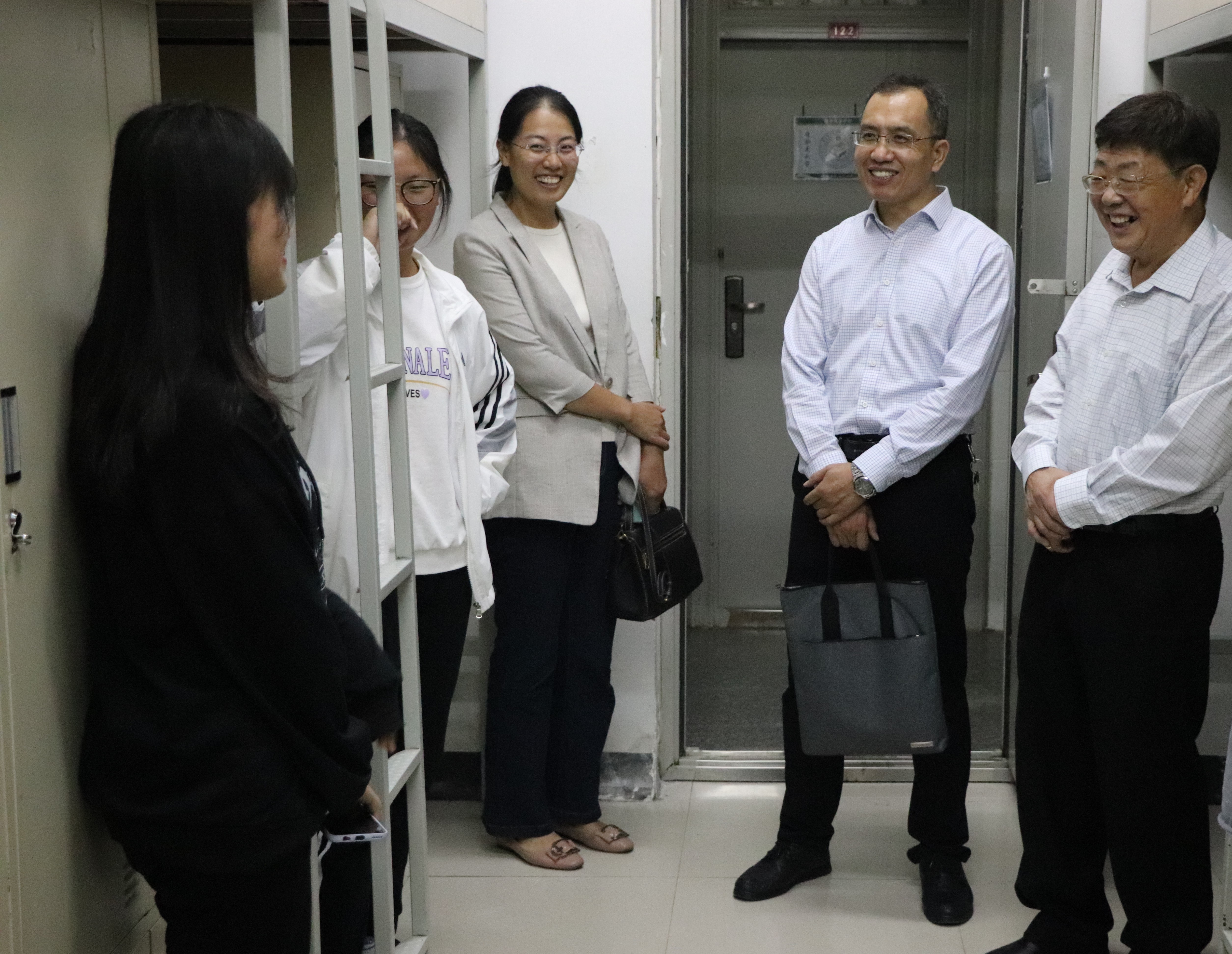月到中秋分外明,人到佳节别样亲。时逢国庆、中秋双节,为表达对新生的关切与爱护,9月30日晚,beat365亚洲体育官方网站经理刘同先,党总支书记韩强,党总支副书记、副经理李军,团委书记王丽静,辅导员丁晨、姚延珠前往宿舍区走访慰问在校员工。