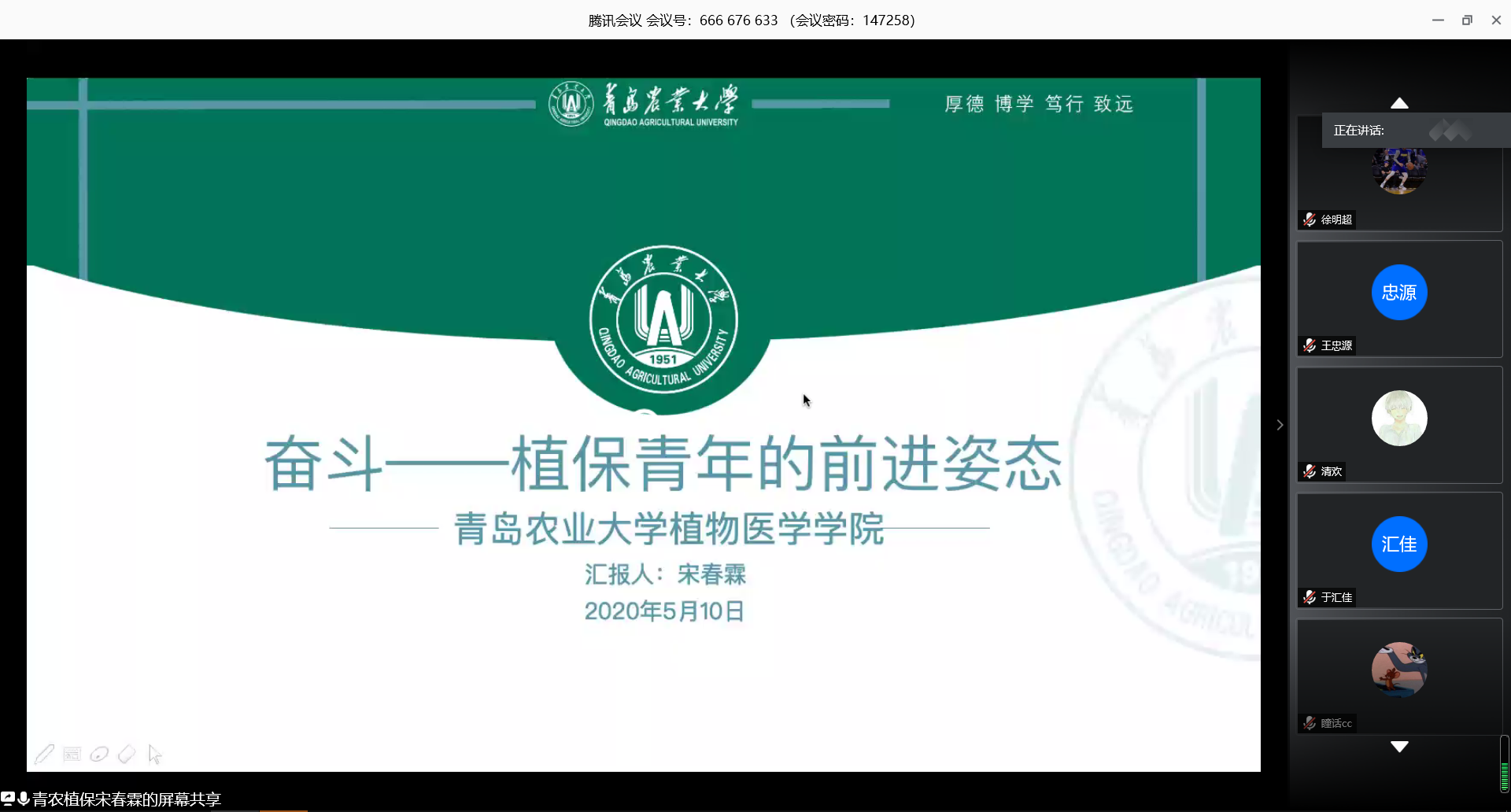 为加强全国植保青年学子相互交流,激励广大青年不惧风雨、勇挑重担,增强植保学子的责任感、使命感和奋斗精神,5月10日,beat365亚洲体育官方网站联合全国兄弟公司举办第十四期“绚丽青春 植手同行”青年成长论坛会,公司优秀员工代表张旭萌、宋春霖以“奋斗——植保青年的前进姿态”为主题进行分享交流,国内其他高校植物保护学科学子积极参加。本次论坛会采用线上会议形式进行,由公司员工会主席徐心悦主持。