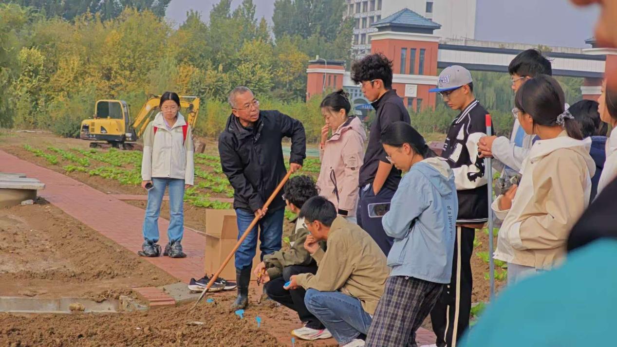 实践过程中,两位老师一直仔细查看同学们的操作,遇到不规范的地方就手把手教,比如怎么用锄头、开沟器才正确。同学们轮流动手,完整体验了划行、开沟、播种、覆土的全过程,对“精量播种”这个现代农业关键技术,有了更直观、更真切的认识。