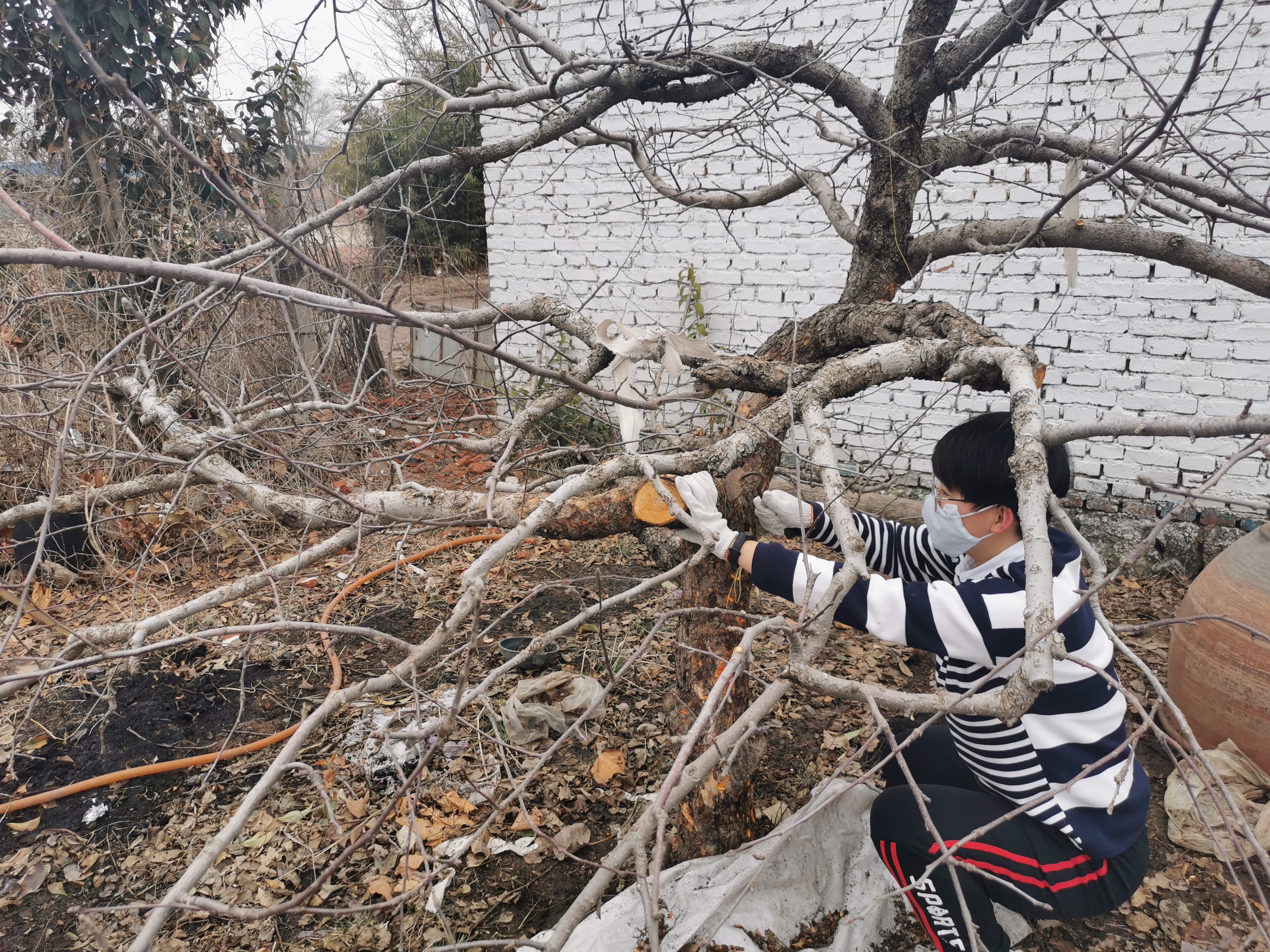 图为韩文姣正在帮助农户清理果树粗皮病引起的病患
