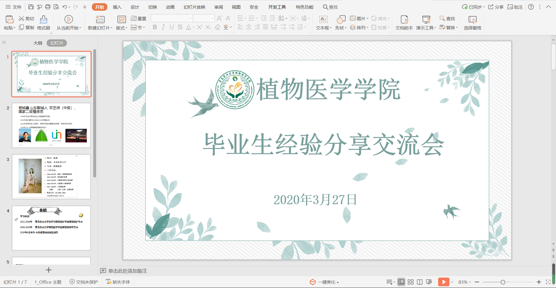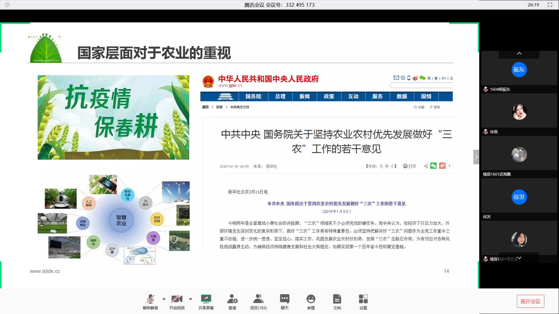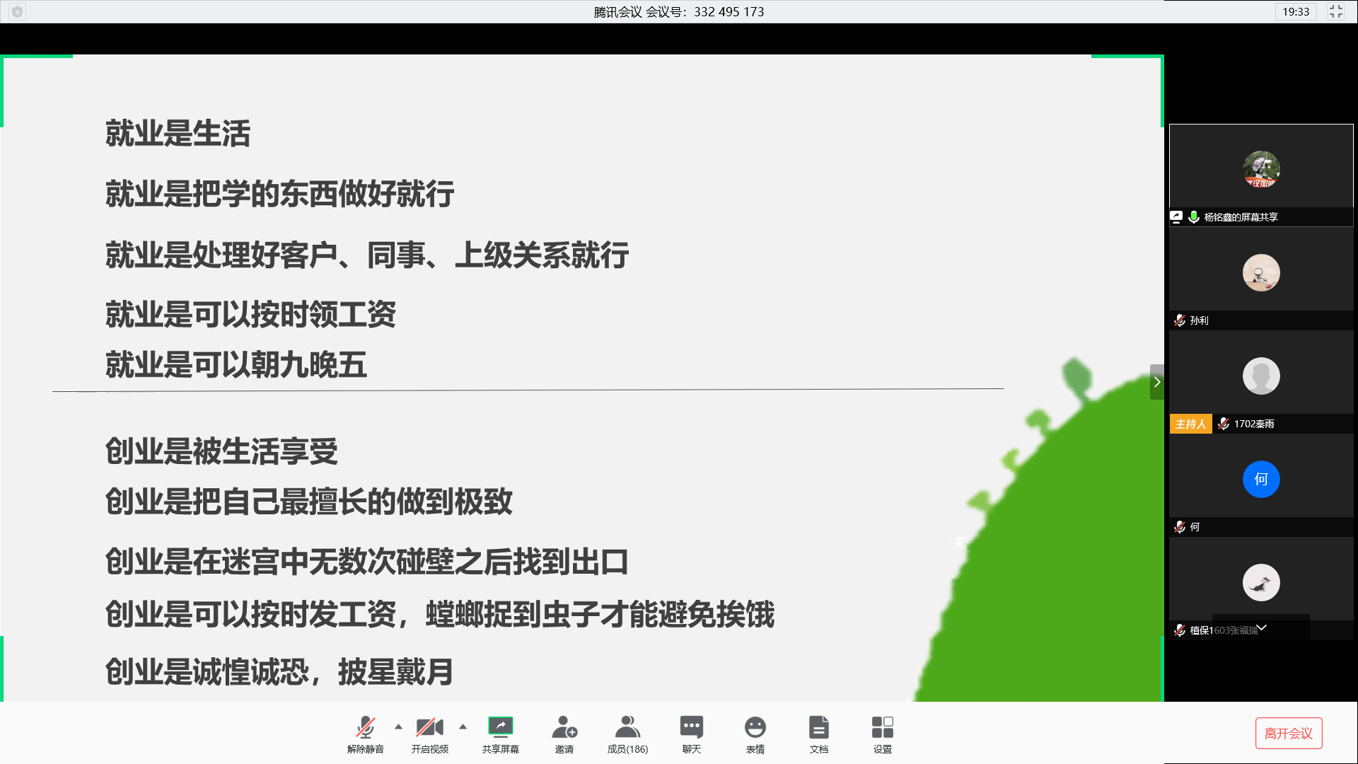 本次会议通过腾讯会议以PPT讲座进行语音屏幕共享的方式进行。植物保护04级员工青岛城市农人农业有限公司创始人杨铭鑫,06级员工、青岛华垦进出口有限公司人事、行政及运营部门经理徐燕,16级硕士研究生员工林晓、薛德胜,14级员工孟浩曼、潘正元,结合就业方向选择、行业前景、国家政策、个人能力与品质和面试注意事项等多个方面向同学们分享了自己就业创业的经验。