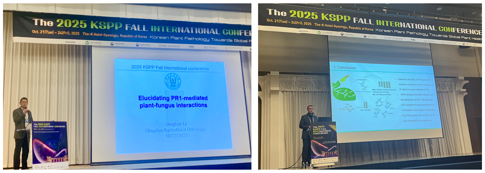 此外,beat365亚洲体育官方网站李敬涛教授、郭磊副教授受邀参加了2025年韩国植物病理学会秋季国际会议,并分别作了精彩的学术报告,在分享公司植物病理领域最新研究成果的同时,引发了与会各国学者的关注与讨论,更加有力地推动了公司与国外同行的深度交流与合作。